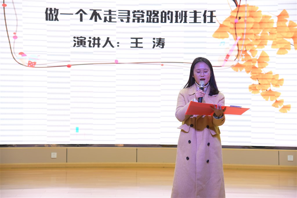 十六位参赛班主任经过充分准备,结合精美的幻灯片开始了动情的演讲。在演讲中,每位班主任分别结合自己的工作经历和个人体会,以真实的故事、饱满的感情、生动的语言呈现出自己对教育的感悟,在一个多小时的温馨演讲中,一个个鲜活的案例,都源于班级管理中与学生交往的真实故事;一个个生动的教育故事,无不渗透着班主任老师工作过程中的喜怒哀乐。我们不仅看到了班主任老师在工作中的认真与智慧,也看到了他们幸福背后的辛勤与付出,更感动于他们在平凡工作中的泪水与欢笑。