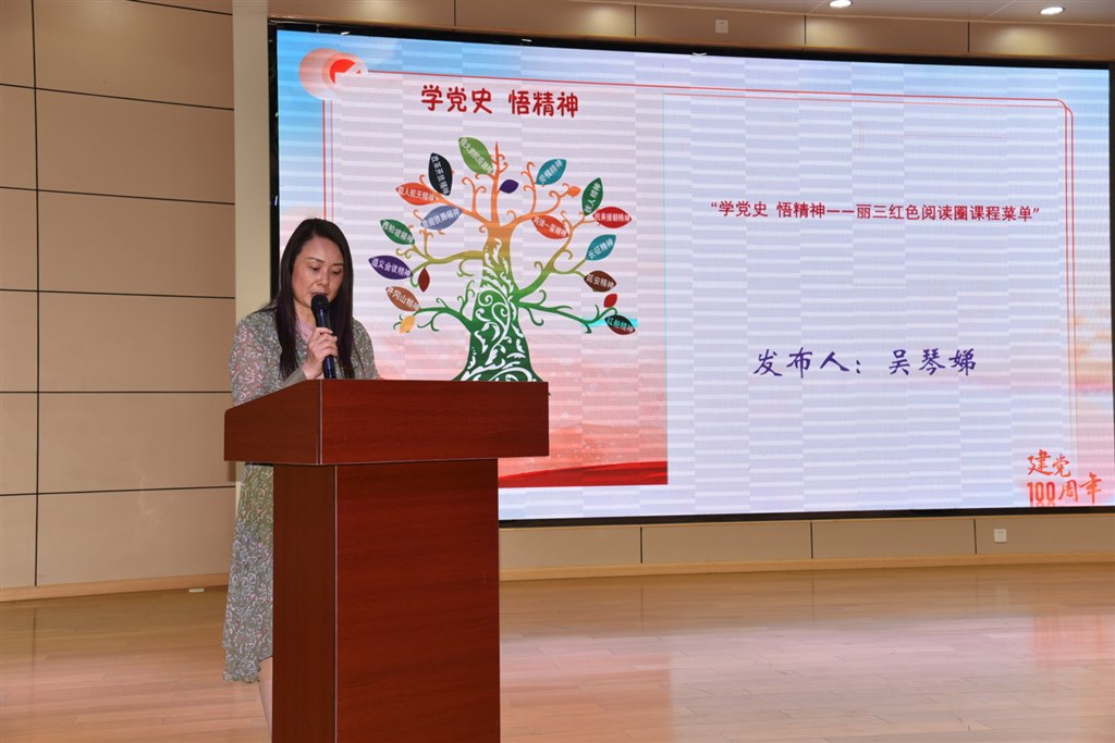 活动的第二项议程是发布专题课程。组织委员吴琴娣发布了我校的特色专题课程:“学党史 悟精神——丽三红色阅读圈课程菜单”。此菜单以百年党史时间为轴,精选出不同时期的具有代表性的十八个红色精神。学校本年度还将相关课程的学习和宣讲嵌入党员活动、行政例会、教师大会、教师各类教研组活动中,渗透在每一个党员的课堂、教育活动中,引导老师们用好革命精神、属地红色资源、爱国主义基地、学习强国新媒体等线上、线下资源。