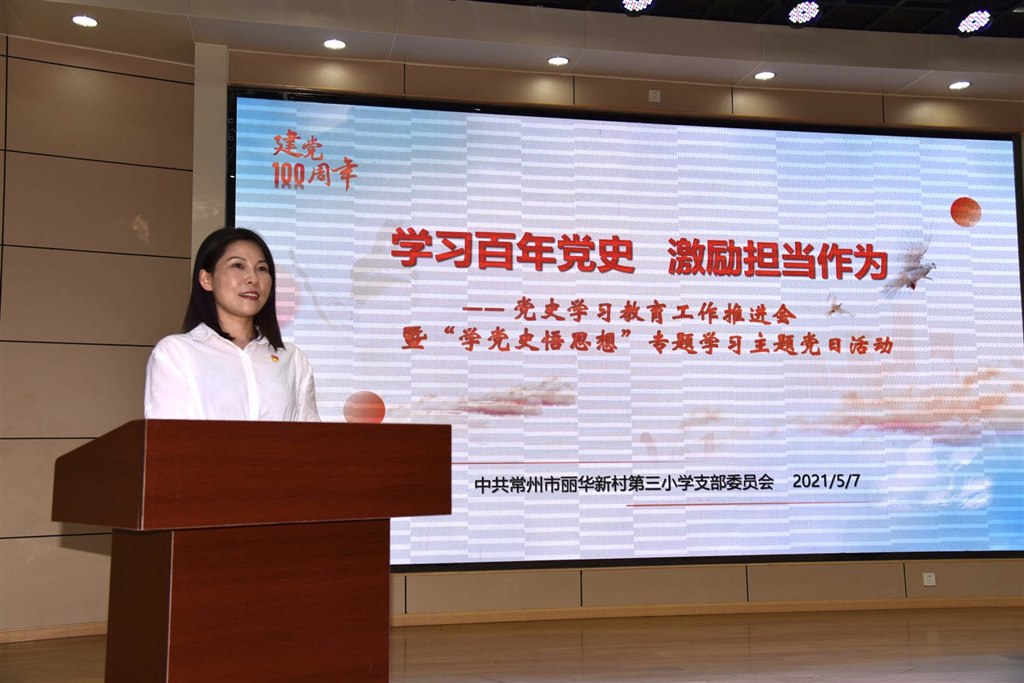为更好的开展党史学习教育,庆祝中国共产党成立百年红色盛事。引导广大党员学史明理、学史增信、学史崇德、学史力行。5月7日下午,中共常州市丽华新村第三小学党支部召开了“党史学习教育工作推进大会”暨“学党史悟思想”专题学习主题党日活动。本次活动的主题是:“学习百年党史 激励担当作为”。学校责任督学杜英姿书记也全程参加了本次活动。
